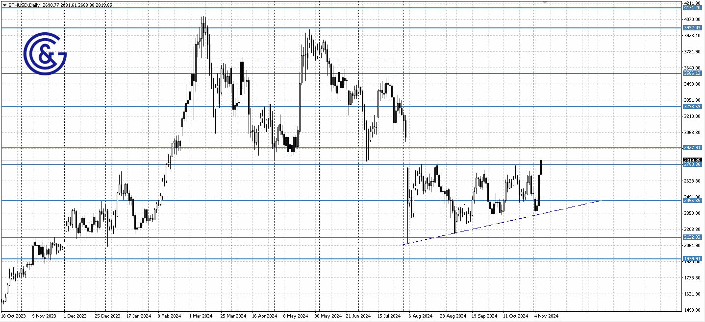 Ethereum is still trading within the ascending triangle, approaching the figure's resistance at the horizontal level of 2780.86. If it is broken out, the upward movement within the triangle could continue, targeting the next resistance at 3293.59.