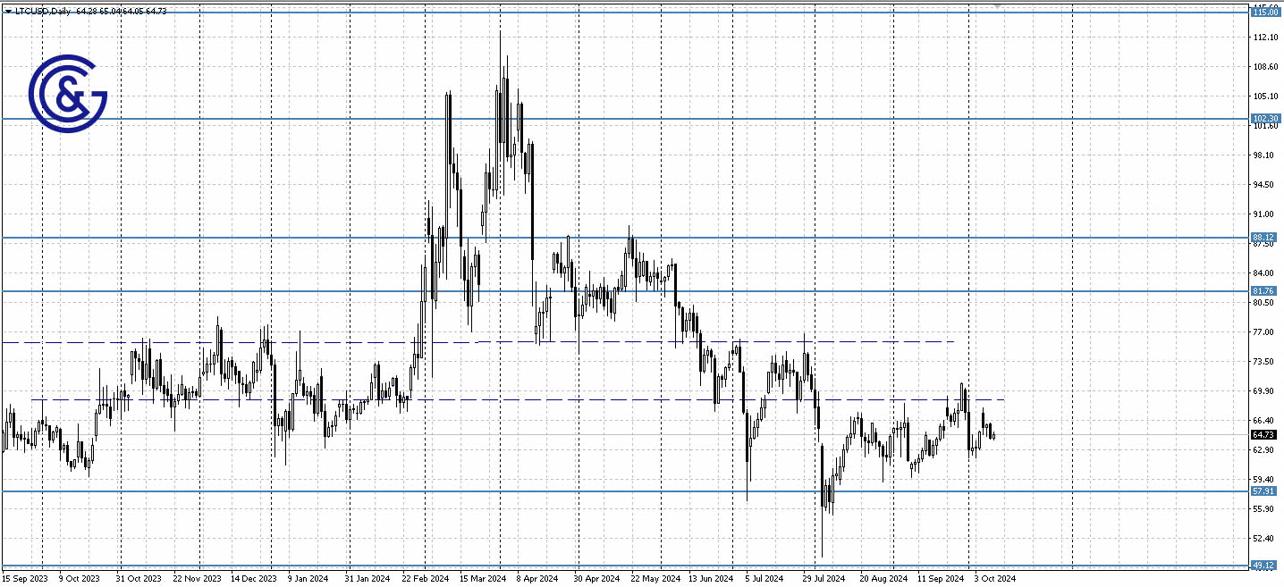Litecoin has once again pulled back from the resistance of the sideways range between 57.91 and 68.80 and is approaching support. If it reaches 57.91, it could either bounce back up or break lower and consolidate below it. Another possibility is a return to 68.80 resistance marked with dotted lines with an attempt to break out and consolidate above it.